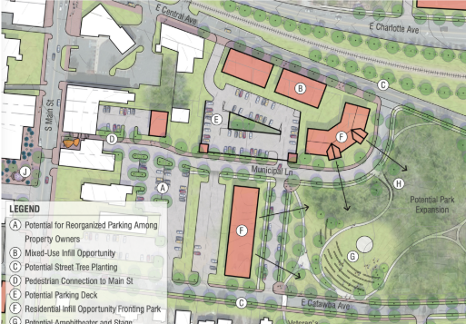 Page 63 of the 2018 Strategic Vision Plan showing the block behind Main Street where development is proposed. This is a rough concept drawing of what could be built there.